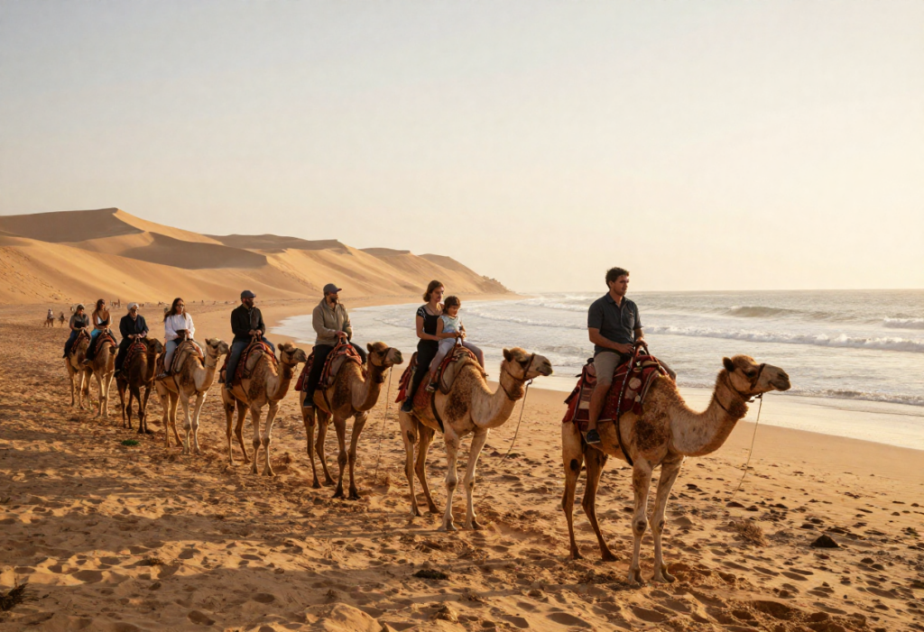 During sunset, the sky turns gold, orange, and pink, reflecting off the Atlantic. The calm pace of the camel and the quiet sound of waves create a peaceful, almost romantic experience.